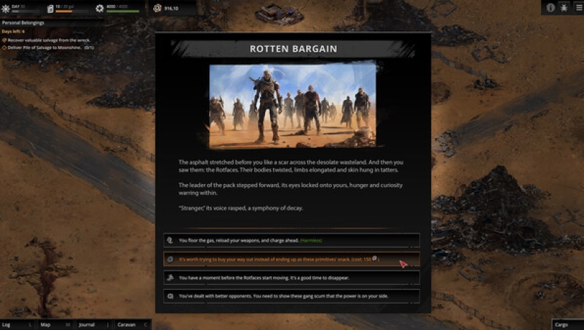 "一切都没有按计划进行。你早晚会失去对炼油厂的控制权。而且……这确实发生了。致命的“锯齿”发动袭击并夺走了你的一切。你的朋友维克多死了。燃料没了、设备没了、伙伴们都离开了。是时候用废品组装你的第一辆车,召集新团队成员,重新回到正轨。抓紧时间,因为“大风暴”就要来了。
