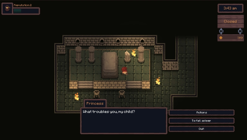 公主仍在沉睡,但她的灵魂与你同在。献上贡品,让她安然入眠,她也会帮助你扩建并改进酒馆。但请小心——若她失望了,可不会轻易放过你。