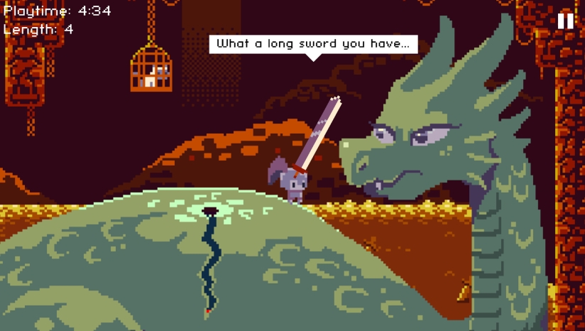最终关卡需精准计算剑的摆动轨迹,将加长后的剑刺入巨龙心脏深处,长度不足或角度偏差均会导致失败。全程操作简易但精通困难,关卡设计融合平台跳跃与物理解谜,考验玩家对力学和时机的把控。