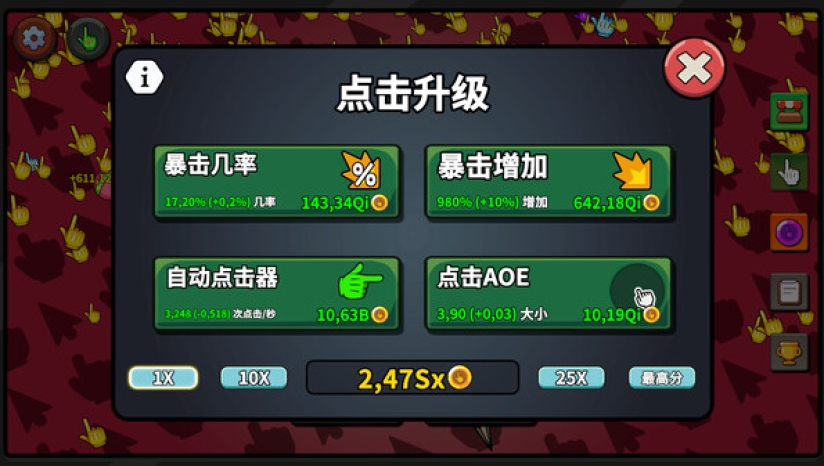 点击飞升!飞升并重新开始游戏可获得点击飞升币,这种币可用于购买永久升级。这些点击飞升没有上限,这意味着只要你愿意,就可以一直玩下去,不断进阶!