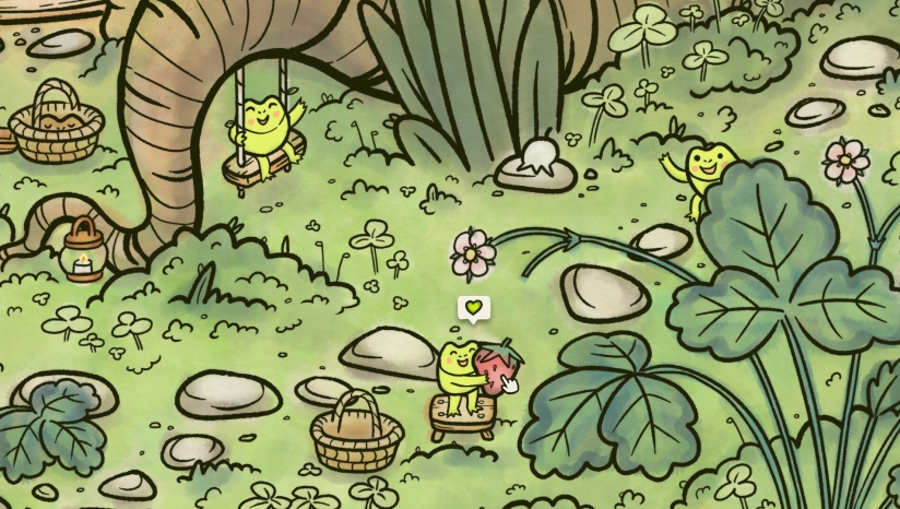 《寻找青蛙》以宁静的“苔藓幽谷”为舞台,玩家将协助善良的“蛙伯伯”召集散落在村庄各处的青蛙与蟾蜍,共同拍摄一张珍贵的全家福。这座手绘风格的村庄隐藏着丰富的生活细节和自然秘密,背景设定摒弃了传统冲突叙事,转而聚焦于探索与重逢的温馨主题。