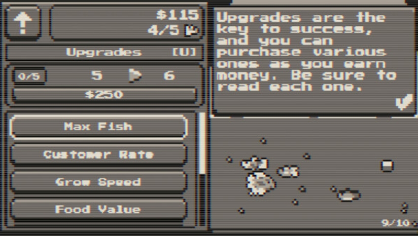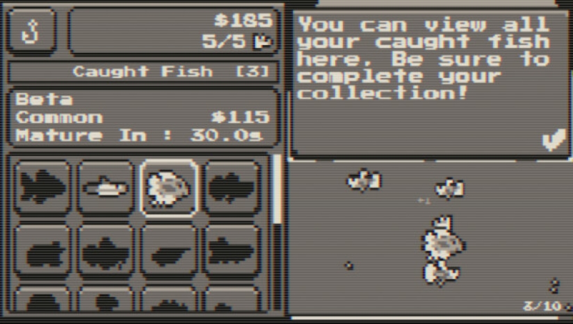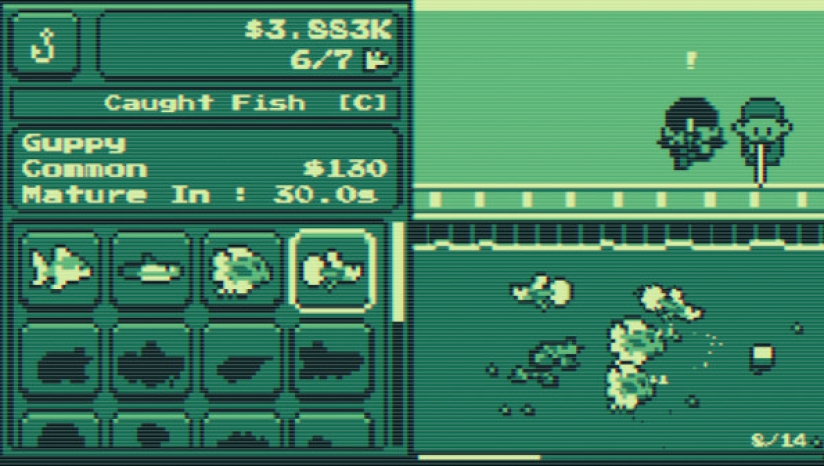 种植和饲养您的鱼类,在渔民捕捞成熟鱼类时赚钱,升级以解锁稀有物种和丰富多彩的新设计,所有这些都以迷人的Game Boy风格设置。