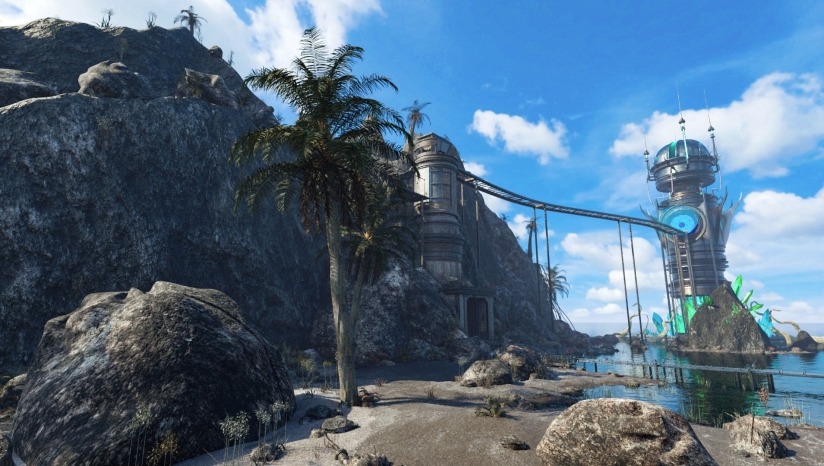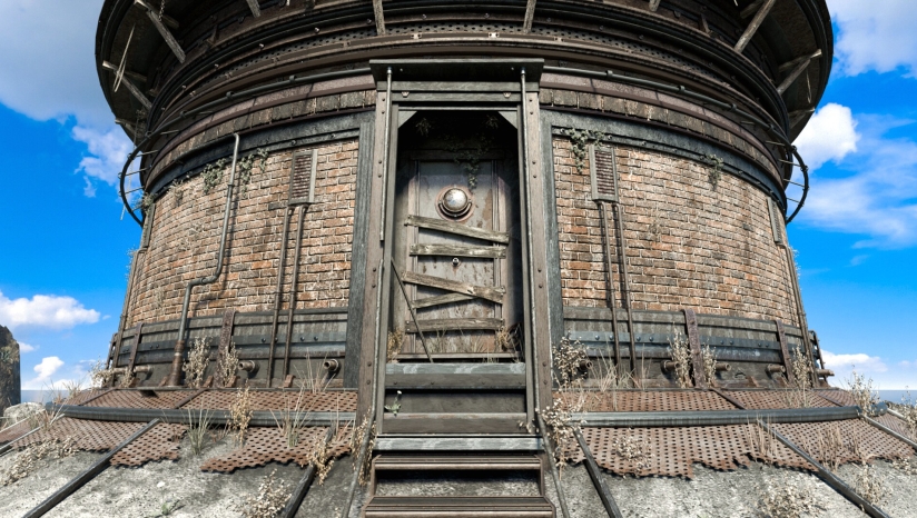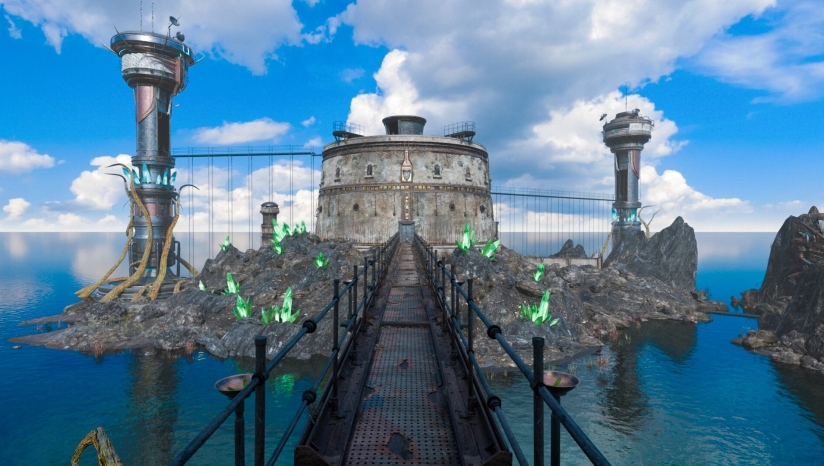 画面质感刻意贴近90年代《神秘岛》《Riven》的像素渲染风格,营造复古未来感。