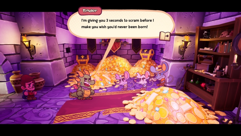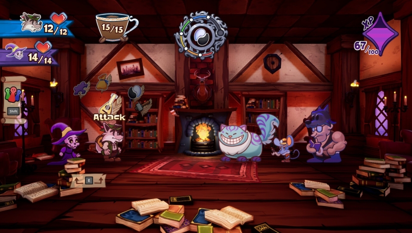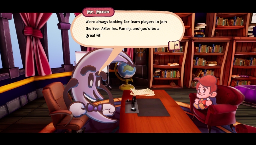 游戏采用2D卡通渲染风格,场景设计融合童话书的手绘元素与现代办公室符号(如城堡中的咖啡机与报表),色彩鲜明且富有视觉层次。角色动作设计突出夸张的戏剧性,战斗特效简洁流畅,契合回合制的节奏感;场景转换则通过翻动“故事书页面”的动画实现,强化了叙事载体特色。