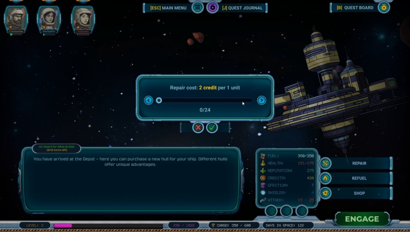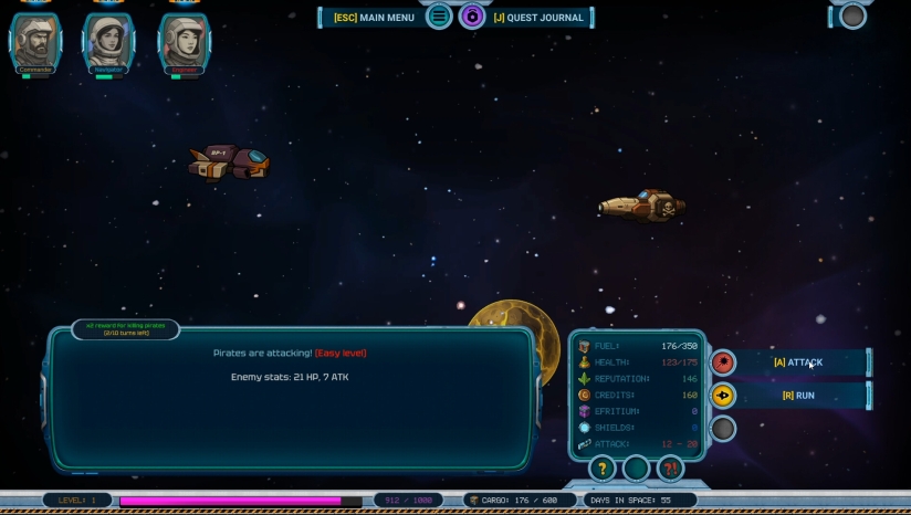 你的团队由三位专家组成:指挥官提升战斗能力。工程师负责飞船维修。领航员规划通往特殊空间站的航线。