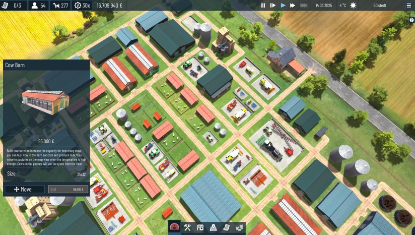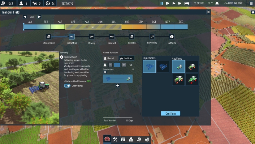 自由选址全球任意坐标,地形、土壤pH值、降水量等数据实时影响作物选择。初期需规划农田分区、建造粮仓/畜棚,并通过购置拖拉机、联合收割机等50+种农机提升效率。