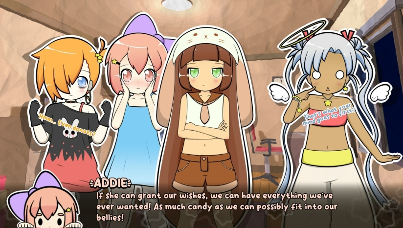 作为互动视觉小说,玩家通过关键选择左右女孩们的愿望内容。每条故事线约20分钟,全流程需3-5小时。核心机制围绕“愿望叠加”,例如首个愿望将角色变为糖果人,后续愿望可能让马桶统治世界,逐步升级的荒诞感贯穿始终。玩家还需触发“摸头互动”推进隐藏剧情,并通过道具系统解锁分支路线。