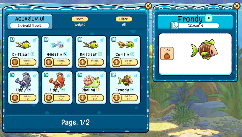 四个鱼缸各有不同的主题与鱼类组合,灵感源自现实世界的鱼类并融合了魔法元素。翡翠波光(Emerald Ripple)、珊瑚之境(Coralspire Reef)、冰封深渊(Frozen Abyss)、魔法之湾(Magic Cove) 每个水族箱都有独特的鱼种等待玩家解锁和照料。