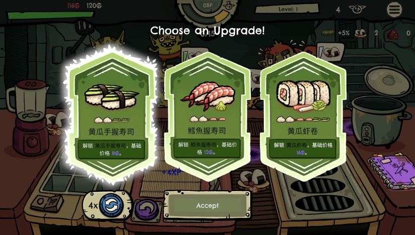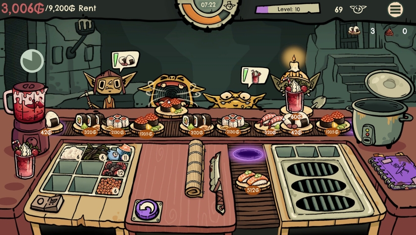 哥布林寿司将肉鸽元素融入餐厅经营模拟游戏。你将扮演一名哥布林寿司师傅,为哥布林同胞亲手卷制寿司。