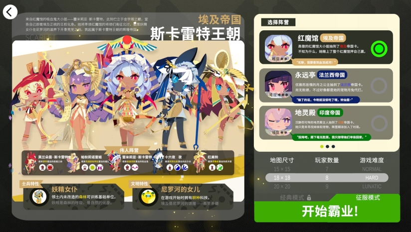 初始可选四大文明(如红魔馆映射罗马帝国),每阵营含5位东方角色担任“王、后、车、马、相”职阶的独特单位,如十六夜咲夜(车)可瞬移突袭。
