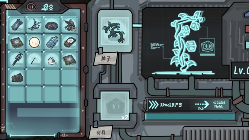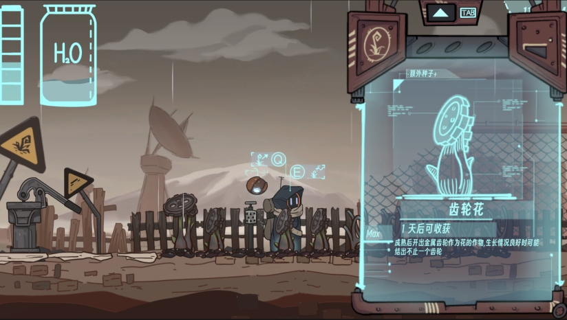 作物系统:种植约45种机械作物(如齿轮花、灯泡果、蒸汽草),产出齿轮、木板等资源而非传统粮食。作物需按环境分区种植(辐射区、深层土壤区等),并可通过变异、共生(如灯光花加速邻株生长)和升级研究(6个等级)提升效能。