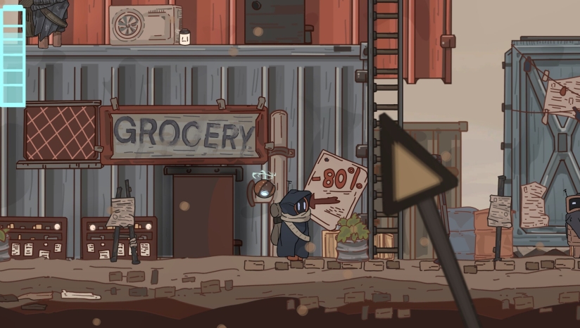 低多边形建模搭配手绘贴图,融合锈蚀金属、裂纹土地等废土元素,营造“粗粝而温暖”的视觉质感。角色设计简洁柔和,避免机械冰冷感。