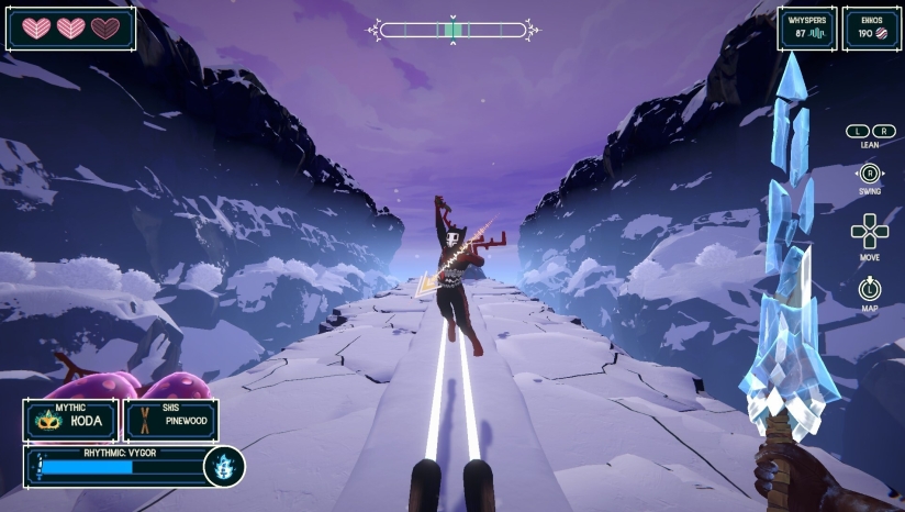 结合节奏驱动的滑雪、战斗与Roguelite元素。玩家需严格跟随动态配乐的节拍,通过重力感应或手势操作(滑行、跳跃、翻滚、格挡、斩击)躲避障碍、击败敌人。操作强调精准同步,失误会导致中断连击或受伤。