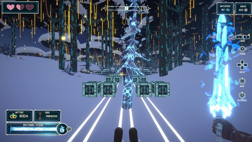 采用第一人称视角的3D风格化画面,突出雪地环境的辽阔感与黑暗侵蚀的压迫氛围。场景设计包含冰川、深渊、神庙等奇幻地貌,配合粒子特效展现滑行轨迹与战斗光影。角色与神话生物的模型兼具北欧神话粗犷感与卡通渲染色彩,动作流畅且与节奏高度契合。界面简洁,仅保留节拍提示与技能状态,减少视觉干扰。