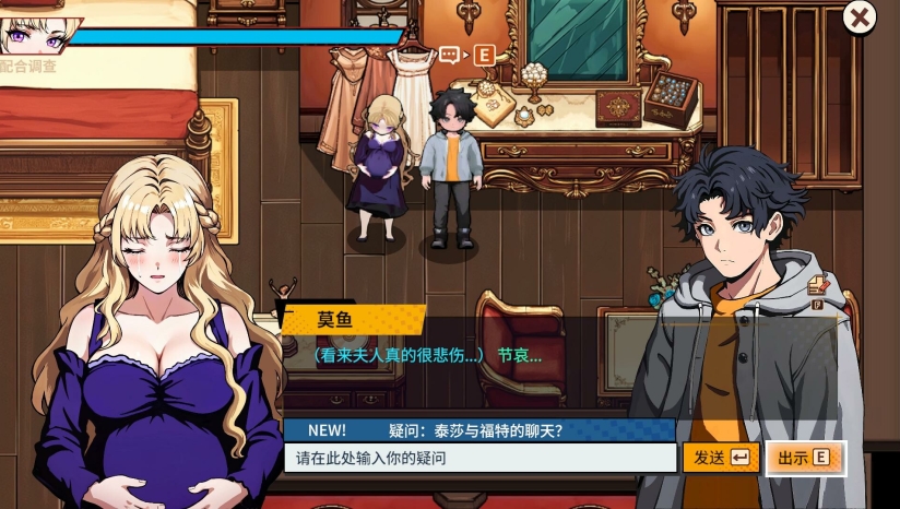 通过文字输入框与NPC自由对话,角色将基于语言模型实时生成符合性格的反馈。对话内容影响好感度、线索获取,甚至触发隐藏剧情。