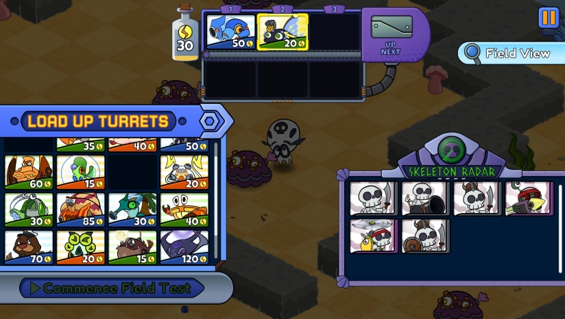 在三个独特生态域(如剧毒卤水池、深海缺光区)中,策略性布置海洋生物炮台抵御骷髅进攻。初始炮台包括手枪虾(高爆发)、海豹突击队(范围压制)、死光魔魟(激光扫射),后续可解锁更多单位。