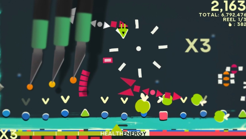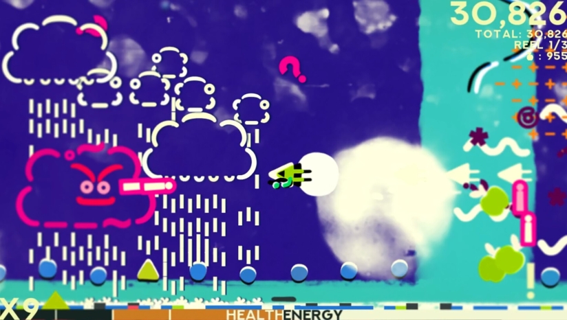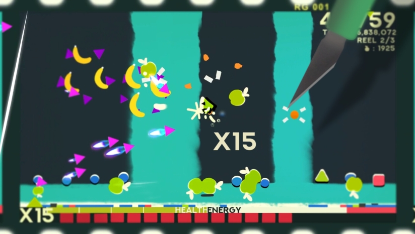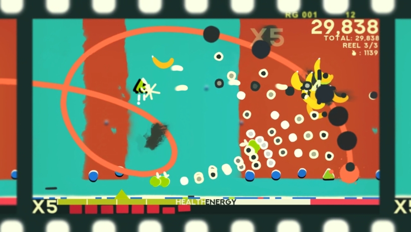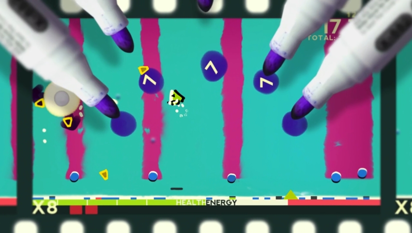 关卡从抽象色块梦境过渡至机械工坊,霓虹色调粒子特效(如弹幕爆炸、冲刺残影)增强动态冲击力。