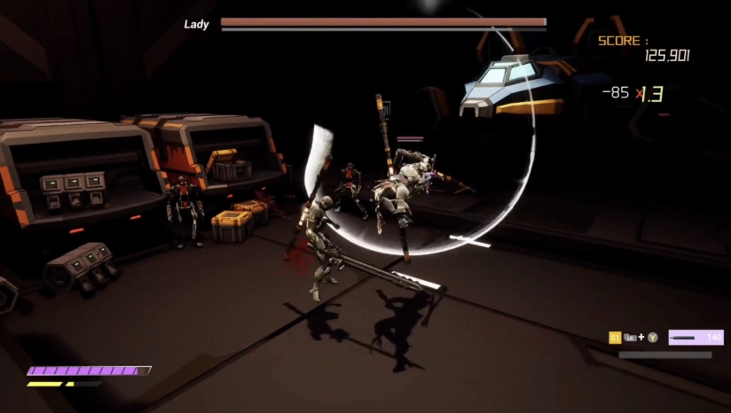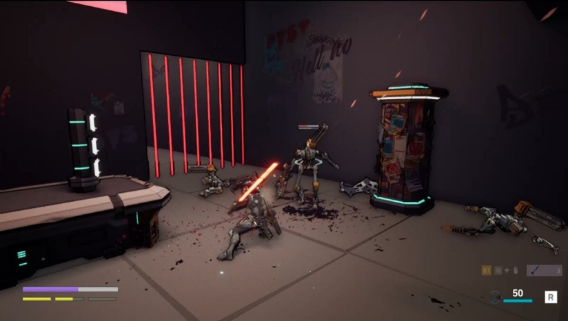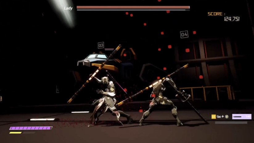 核心战斗围绕精密反击机制展开:通过预判敌人攻击进行精准反击,将机器人击飞至空中并以重击终结(类似“饭刚落”动作)。战斗中需灵活运用环境交互,如将敌人撞向墙壁造成眩晕,并利用场景中的弹药箱、油桶等资源补充战力。支持多武器无缝切换(主武器近战/副武器枪械),积攒能量后可释放大范围清场技能。
