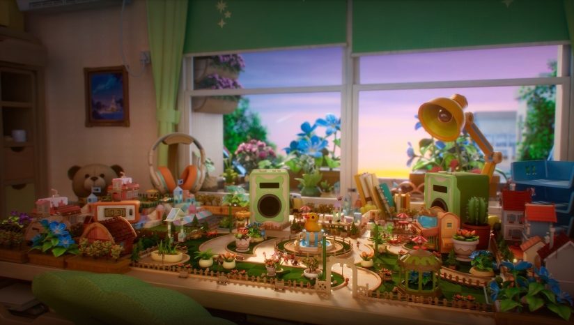 游戏采用“富有生活感的风格化卡通”美术,融合绘本笔触与皮克斯式动画质感。技术层面运用实时全局光照、体积雾效及高精度渲染,强化微观世界的细腻感。场景设计注重叙事细节:木质书桌保留使用痕迹,牛奶盒小屋、耳机秋千等创意物件兼具童趣与真实感,营造温暖沉浸的视觉氛围。
