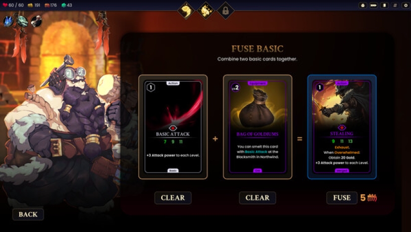 战斗奖励可熔炼为宝石镶嵌、卡牌复制或融合升级,相同卡牌三合一会觉醒为传说变体,每张强化卡都保留原始插画细节。