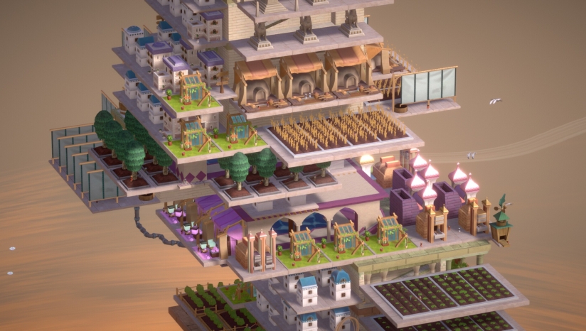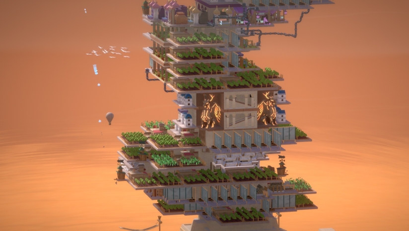 玩家需从沙漠基座起步,逐层向上建造高塔,穿越六大生态迥异的大气区(风沙、迷雾、雨水、冰雪、晴空、星空),每层需独立规划生产链(如农场、资源加工厂)并应对独特环境挑战。