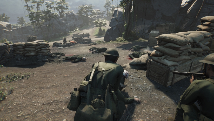 关卡设计还原太平洋战场地貌与战役节点,伤员台词揭露个体命运(如寻找未婚妻的士兵最终得知其死于空袭)。