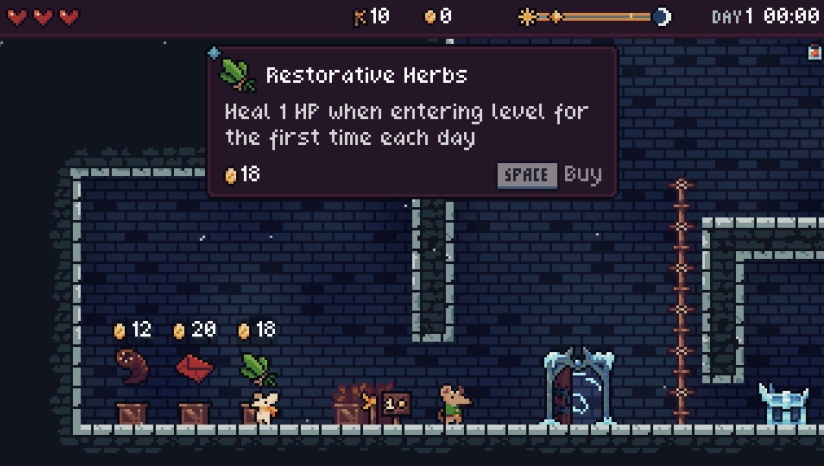 每天,你都需要在夜幕降临之前抢劫地牢并找到返回商店的路。在那里,您可以购买各种升级,以便在接下来的几天内在同一运行中进一步推进。