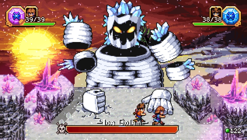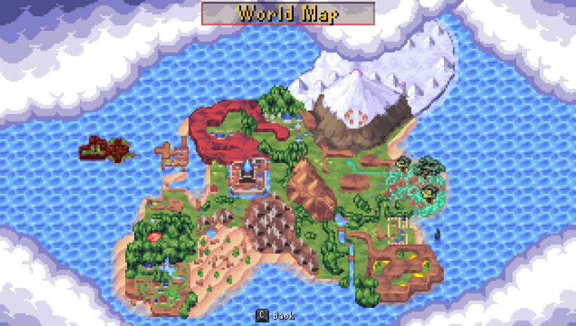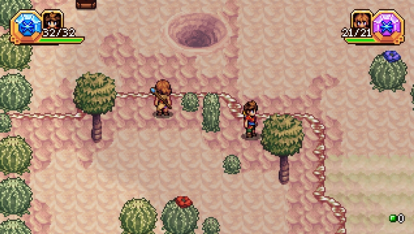 游戏采用16位像素美术风格,致敬超级任天堂时代的经典RPG。场景设计色彩明快,从葱郁森林到幽暗地牢均充满细节;角色动作帧数流畅,技能特效以粒子光效强化元素视觉辨识度(如火焰爆裂、冰霜蔓延)。地图采用多层卷轴设计,营造出广阔而层次分明的世界感,搭配昼夜天气变化,重现90年代像素艺术的黄金质感。