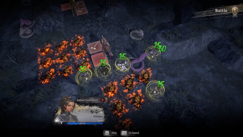 在方格地图上进行快节奏布局,结合环境互动(如元素反应、地形优势)和技能协同(200+技能系统),策略性规划角色行动。