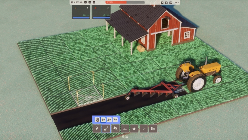 游戏采用极简清新风格,以低多边形建模呈现草地、农具与作物,搭配柔和的自然光影效果。界面设计简洁直观,操作时田地会以工具特定颜色高亮显示(如蓝色起始点、红色终止点),提升操作可视性。环境音效以风声、机械声为主,营造宁静而专注的农场氛围。