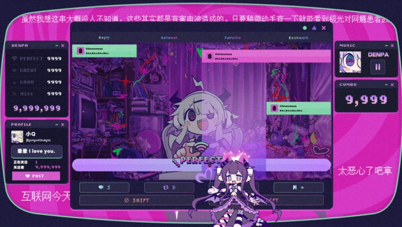 根据电波歌曲节奏完成按键操作(适配键盘/MIDI控制器),副歌前输入文字碎片,高潮段自动生成完整「怪文书」;