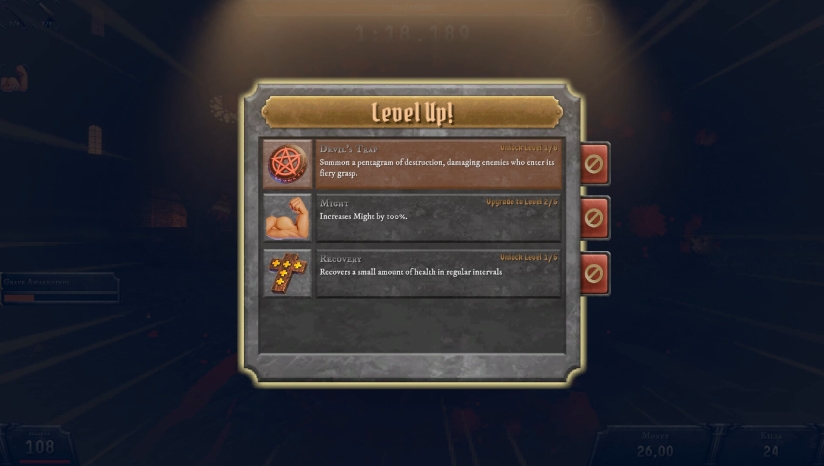 游戏采用第一人称视角重构了幸存者类玩法,结合快节奏连招系统与高密度敌人潮,要求玩家通过精准走位实现每分钟超200次击杀的“割草快感”。玩法包含200多种随机道具组合和动态难度BOSS战,支持本地双人合作模式。游戏提供自动与手动双射击模式,兼顾不同操作偏好玩家需求。通过局内掉落超过30种可组合模组(如霰弹散射增幅器、电浆蓄能核心),玩家可以构建近战链锯流、弹幕覆盖流等差异化战斗流派。游戏还设有永久强化机制,玩家可在局外使用“恶魔残骸”升级基础属性,解锁二段跳、子弹时间等战术能力,形成螺旋上升的成长循环。