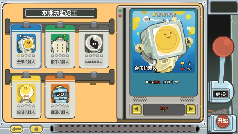 游戏画面采用可爱动物与机械质感融合的风格,最初设定偏重硬核机械风,后调整为更符合大众审美的诙谐可爱动物形象。开发团队对UI进行了细致打磨,将核心操作按钮设计为大而鲜艳的拉把,并加入机器人手部动画,增强操作反馈感。游戏界面设计注重立体感和层次感,将遗物功能从屏幕内转移到轮盘机外框边缘,设计成类似Switch卡带的贴纸。战斗背景会随难度进程变化,主界面具有纵深感和时间丰富度,通过细节实现碎片化叙事。角色选择界面设计为农场木板贴头像的创意,难度选择则做成实体按键,强化了整体游戏世界的机械氛围。