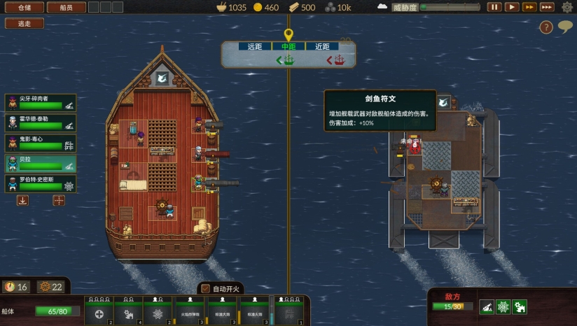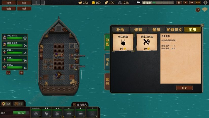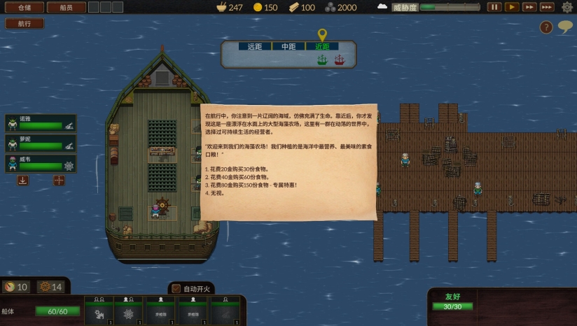 游戏采用像素艺术风格呈现,营造出独特的蒸汽朋克视觉美学。舰船、角色和环境设计细腻,成功传达了海上冒险的氛围。界面设计清晰展示各类游戏信息,包括舰船状态、船员属性和资源情况。不同的海域环境如迷雾海域和风暴海域各有特色,增强了探索的多样性和视觉变化。