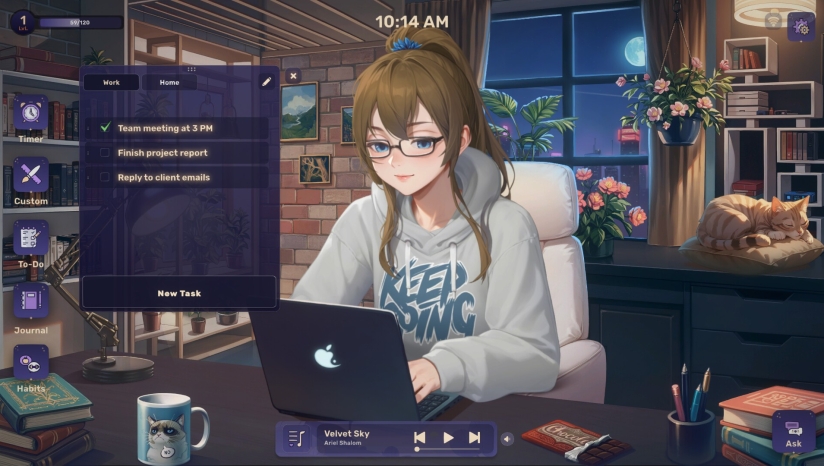 简中《Lo-Fi Girl:AI Assistant》是一款由Dirty Adventures开发制作并发行的休闲模拟游戏。是一款融合治愈氛围与实用功能的游戏,基于热门Lo-Fi文化打造,玩家可创建专属虚拟形象,通过400+项定制选项设计发型、服饰甚至宠物伙伴。游戏内置丰富低保真音乐播放列表,可搭配雨声、柴火等环境音,并调节昼夜场景营造个性化氛围。作为“gamified focus tool”,它提供计时器、待办清单等productivity工具,AI助手会智能适配场景推荐音乐。玩家既能装饰温馨房间、收集萌宠,也能单纯沉浸在温暖色调与慵懒节奏中放松。