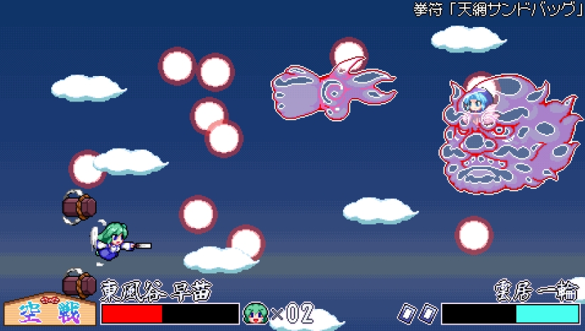 游戏深受《星之卡比》启发,技能吸收与形态变换系统丰富,早苗可切换近战、远程与范围攻击形态,战术多样。剧情演出全程配音,早苗的无厘头吐槽与角色互动充满趣味。为照顾不同水平玩家,游戏设有“BREEZE模式”,可降低受伤并增加生命恢复物品,帮助新手熟悉操作。BOSS战会使用类似原作的符卡,玩家需灵活运用吸收的技能应对华丽弹幕。
