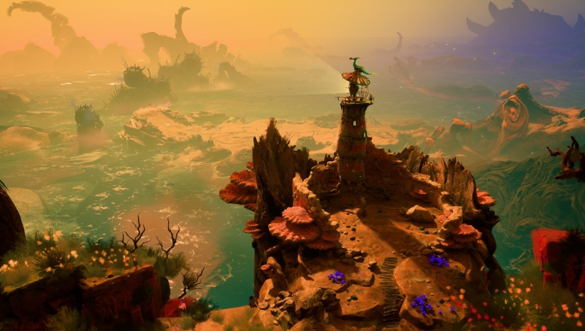 《Keeper》的故事发生在一个被时光遗忘的后人类世界。在一片遥远的海域,一座沉睡已久的灯塔静静伫立于山脉的阴影之下。当被称为“凋零者”的紫色藤蔓悄然蔓延、交织汇聚时,这座古老的建筑意外苏醒,并奇迹般地长出了四条细长的腿。游戏中,一只名为Twig的海鸟在躲避“凋零者”追逐时偏离航线,撞上灯塔并意外激活了灯塔信标,驱散了黑暗。这一对看似不可能的组合由此结伴,踏上一段通往未知世界的非凡探索。它们没有明确的终极目标,只有内心隐约的召唤在询问:“山那边究竟有什么?”