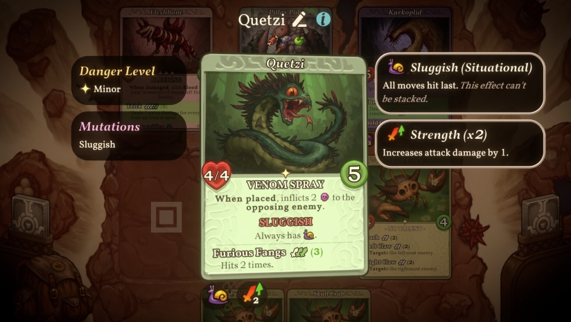 《驯牌师》的核心特色在于其创新的“活体卡牌”系统。每张卡牌代表的生物不简单是战斗工具,而是有自主性的伙伴,它们会战斗、受伤,甚至永久死亡。游戏提供了深度的卡牌定制可能性。玩家可以将怪物融合、变异,甚至献祭,在怪物间转移技能,打造独特的连招组合。每一个决定都会永久改变队伍构成,使得每次选择都至关重要。程序生成的深渊关卡、多样的随机事件以及丰富的可解锁内容,为游戏提供了极高的重玩价值。每次冒险都会面临新的生物组合、挑战和策略机会,鼓励玩家尝试不同的游戏风格。