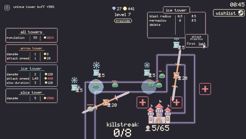 《城堡闲置》(castle idler)是一款休闲塔防游戏。由Soy Boy Games开发制作,未来将上线steam平台。没有波次攻击。你可以悠闲地升级塔楼、收集金币,并解锁庞大的技能树,以保卫你的城堡免受史莱姆的入侵。