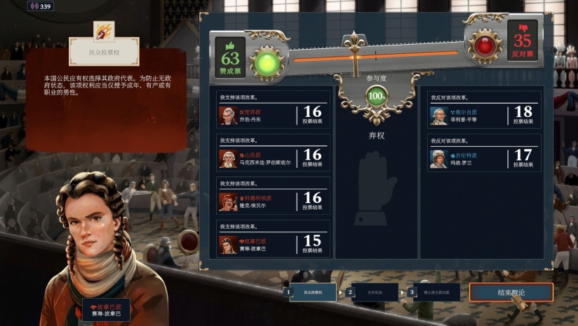 本作是一款以意识形态为导向的回合制战略游戏,融合了丰富的战术战斗与政治博弈元素。在军事方面,玩家需要征召步兵、骑兵、火炮构建军队,并投资建造新型巨像机甲以扩张领土。战斗中,你可以指挥由冷兵器、火药和机甲组成的混合部队协同作战:命令线列步兵构筑防线,炮兵提供后方支援,骑兵迂回穿插,关键时刻出动巨像机甲正面洞穿敌人防线。游戏强调了政治舞台的运筹帷幄。随着革命推进,你将结识罗伯斯庇尔、拉法耶特、丹东等历史名人及其代表派系,通过外交技巧拉拢、对抗或击败他们。在你控制的区域建造并升级基础设施,提升繁荣稳定度,通过宣传使各社会阶层接纳你的理念,从而在国民议会中赢得更多席位,颁布政令实现政治蓝图。