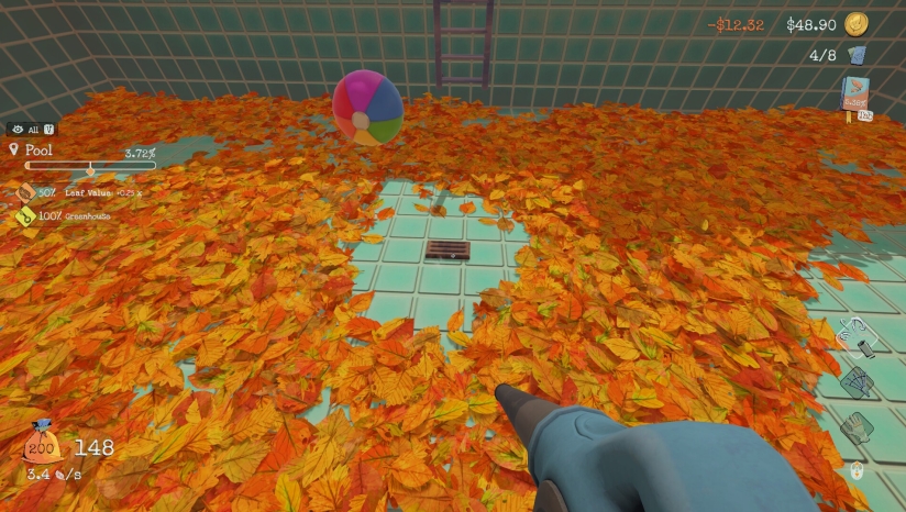 游戏初期,玩家只能徒手捡拾落叶。通过持续清理,玩家可以获得金币奖励,这些金币可用于解锁更高效的清洁工具,例如耙子、吹风机和垃圾袋。使用耙子可以将落叶集中到特定区域,吹风机能快速吹散树叶,而垃圾袋则方便一次性打包清运。玩家甚至可以尝试将落叶冲入泳池排水口,不过这可能引发堵塞问题。游戏中的房屋被划分为多个区域,每个区域设有独立的清洁进度条,玩家可以通过日志追踪任务进度。初始阶段车库处于锁定状态,玩家需要用手收集落叶积累初始资金并找到开启方法。一旦进入车库获取工具,清理效率将显着提升。游戏进程鼓励玩家通过反复游玩来提升效率,并设有基于总清洁时间的全球排行榜。