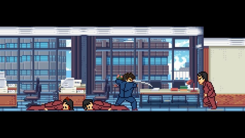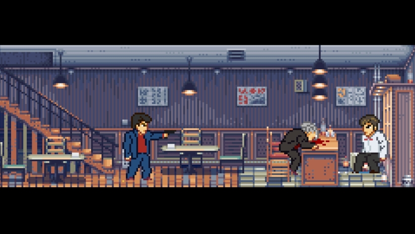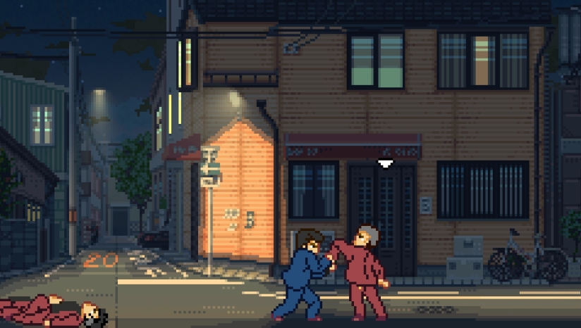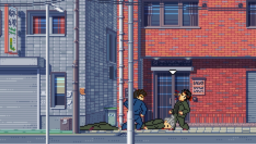游戏采用精致的像素风格,虽然画面简洁,但动作流畅度高,打击感出色。场景设计兼具日式生活气息与黑帮斗争的压抑感,如昏暗的街角与繁华的娱乐场所形成鲜明对比。音乐方面,主界面旋律悠长悲怆,战斗时节奏紧张,有效烘托了游戏氛围。