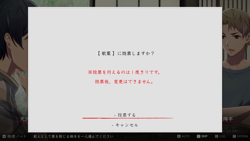 游戏采用典型的文字冒险玩法,核心机制基于“谋杀之谜”模拟游戏类型。玩家需要在封闭环境中搜寻事件的真凶,同时自己也是嫌疑人之一,会受到其他人的质疑。游戏流程分为三个明确阶段:调查阶段、一般性讨论阶段和投票阶段。在调查阶段,玩家通过与嫌疑人进行一对一的秘密谈话来收集线索和信息。在讨论阶段,所有嫌疑人陈述他们对案件和罪犯的推断,玩家需要通过选择同意或否认来维护自己的可信度。最后,在投票阶段,所有嫌疑人投票选出他们认为的罪魁祸首。游戏设有多重结局,玩家的选择将影响故事走向。如果在故事终局时未能赢得足够的信任,玩家角色可能会被当作真凶。