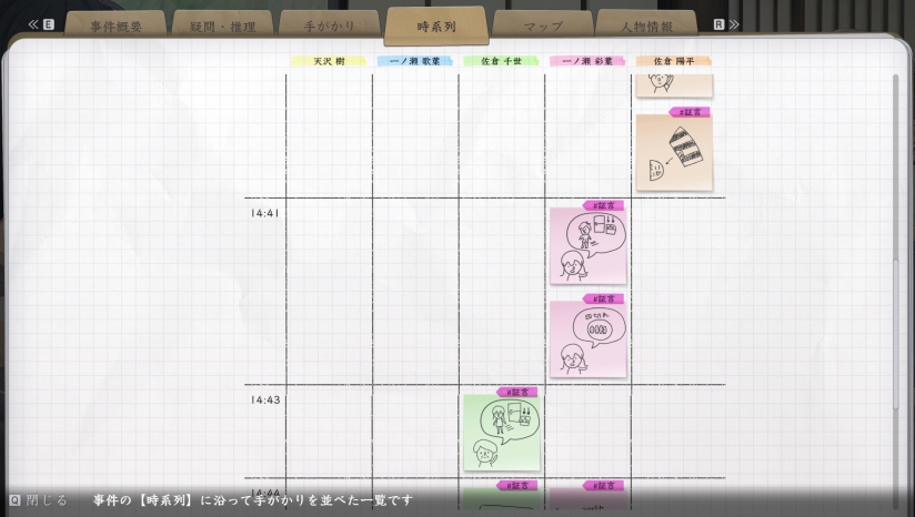 本作最大的特色是时间跳跃机制。主角天泽树能够通过一张13年前的岛民合照回到过去,并在不同时间线中解决谜题。每次改变过去都会影响现在,产生新的时间线和故事发展。游戏中的推理元素注重不在场证明的排查而非复杂的诡计。玩家需要在有限的时间内,通过与其他角色的对话收集线索,逐步拼凑出事件真相。游戏还引入了“信赖度”系统,玩家的选择不仅影响剧情走向,也决定了其他角色对主角的信任程度。