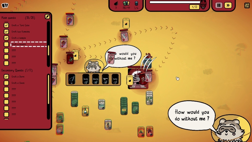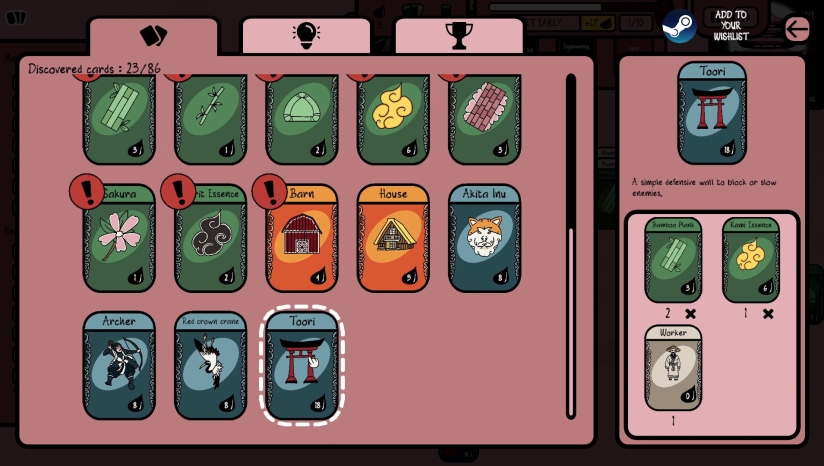 1、堆叠你的卡牌以生产新资源,最大化产量,并在妖怪浪潮到来之前打造受日本神话启发的防御单位。