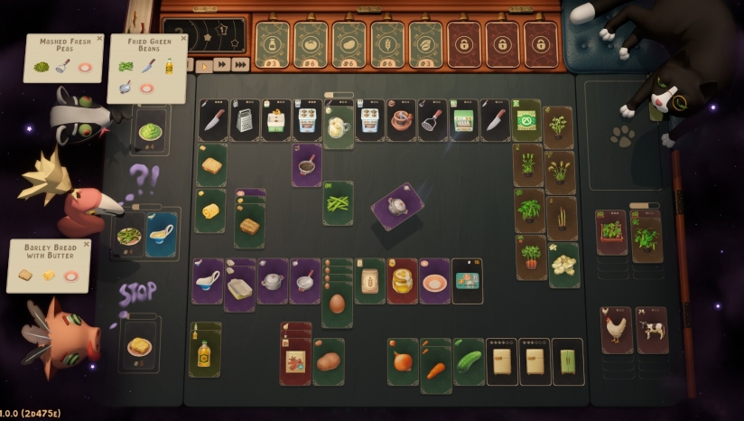 本作核心玩法融合了卡牌策略、解谜元素和资源管理。玩家收到的每个订单都是一个需要解开的谜题,必须通过组合不同的卡牌来对应食材和烹饪工具,及时完成食物制作。游戏中包含种植和管理食材的环节,玩家需要合理管理库存,购买卡组并出售多余物品,甚至种植自己的食物。随着游戏进程推进,成功完成订单可获得奖励,用于升级卡组、工具和餐厅的库存容量。游戏包含超过30个关卡,每个关卡都允许玩家自由发挥,尝试从沙拉到甜点的多种英式菜谱,还有一些隐藏关卡等待解锁,提供了丰富的重复可玩性。