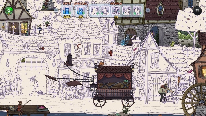 游戏的核心玩法是典型的“找茬”模式,但专注于寻找形态各异的猫咪。玩家需要通过仔细观察和点击,在细节丰富的场景中发现这些可爱的小生物。游戏主要提供两种模式:普通模式中,玩家需要在固定位置找到120只猫,并有3次使用提示的机会;进阶模式则更具挑战性,提供了200只随机位置的小猫,并需要找到12只特殊猫咪来解锁奖励关卡,同时通过寻找20位城市居民来获得额外提示。