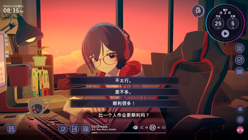 《Chill with You : Lo-Fi Story》是一款帮助你专注于工作的有声小说游戏,让你与喜爱写小说、充满幻想的少女——聪音(Satone)一起在书桌前工作。去自由定义那些展现聪音情感的Lofi音乐、环境音和风景吧,能帮助自己更专注于工作!随着你投入更多时间与她共度,彼此的信任关系将逐渐加深,或许你们的心灵也能真正相通……?