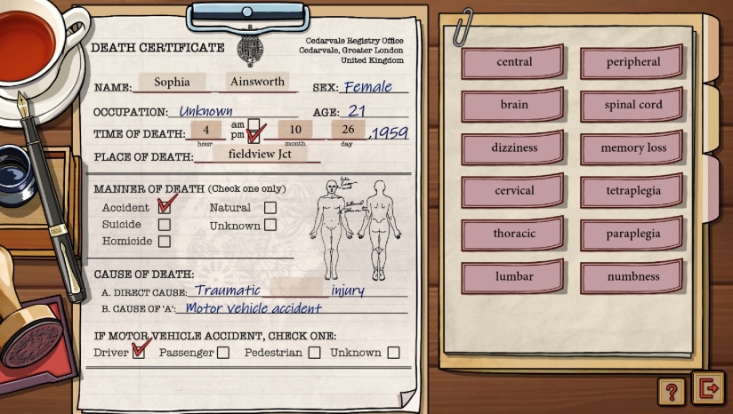 游戏玩法以本格推理为核心,玩家需亲自探索诡异的案发现场,仔细分析每一个蛛丝马迹。作为一名法医,你不仅要记录尸体状况、提取关键线索,还需要审问嫌疑人,最终将推理结果写入完整的法医学报告中。游戏中最具特色的环节是完成死亡证明、医疗记录等专业文书的填写,每一步判断都直接影响案件结果。如果你擅长解谜《奥伯拉丁的回归》或《黄金神像谋杀案》,这款游戏将为你带来更具专业性的挑战。