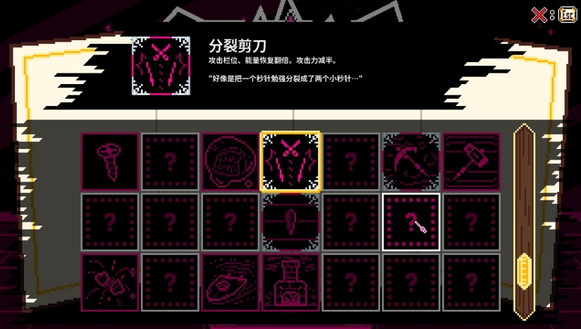 本作的核心玩法独特地融合了时间暂停机制、弹幕战斗和Roguelike元素。玩家需要灵活运用时钟指针的能力,在关键时刻暂停时间,躲避密集的弹幕攻击,或穿梭于弹幕缝隙间发动突袭。“时间”是游戏中唯一的资源管理系统:暂停时间、购买道具、甚至受到攻击都会消耗时间,而通过击败警卫兵可以夺回“时间碎片”,形成战略循环。游戏采用Roguelike设计,每局游戏的地图布局、道具掉落和敌人配置均为随机生成,确保每次冒险都是全新体验。玩家可以收集和组合博物馆中的各种道具,形成独特的成长路线。随着逃脱进程推进,敌人和首领会越来越强,需要玩家巧妙运用时间暂停能力和道具组合来突破重重关卡。